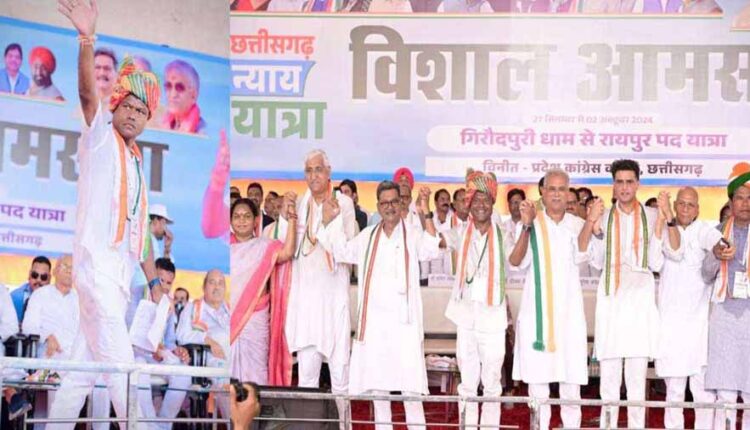छत्तीसगढ़ में कांग्रेस की न्याय यात्रा का समापन गांधी मैदान में आमसभा के साथ हुआ. आमसभा में सरकार के खिलाफ कांग्रेस के सभी बड़े नेता जमकर गरजे. पायलट, बघेल, महंत, बैज, साहू, चौबे और मरकाम जैसे नेताओं ने सभा को संबोधित करते हुए कहा कि अगर सरकार सचेत नहीं हुई तो प्रदेश भर में संग्राम होगा.
